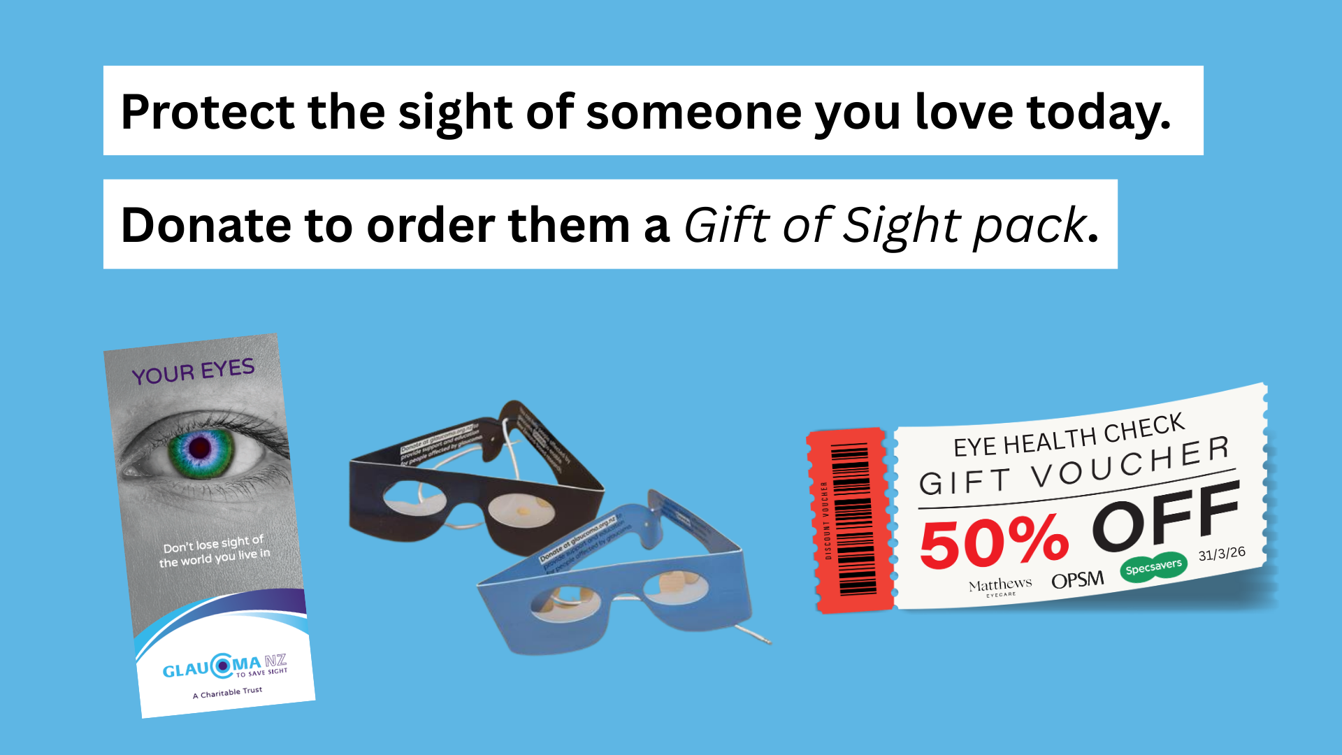 Your Gift of Sight pack will include a 50% discount voucher to get an eye health check at a Matthews Eye Care, OPSM or Specsavers store in NZ.